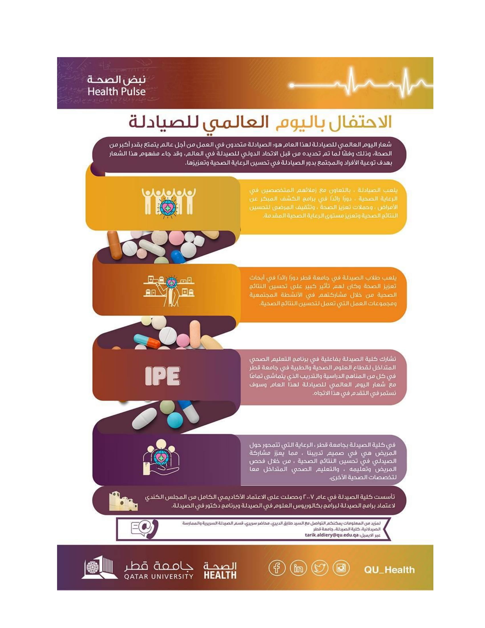 Read More... IPE The College of Pharmacy is actively participating in the QU Health interprofessional education program both in the curriculum and training which is in complete alignment with the theme of this year’s World Pharmacist Day, and we shall continue to advance in this direction.